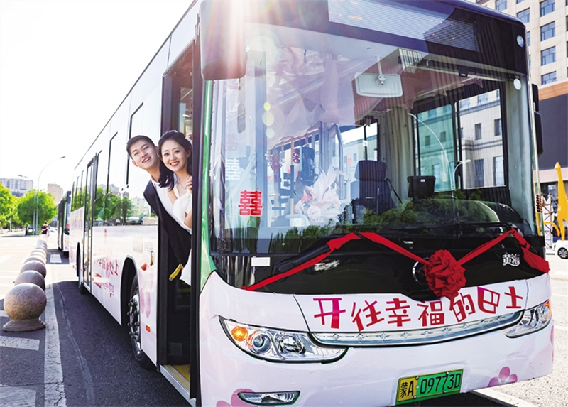 22对新人选择用公交车作为婚车向幸福出发,由传统的“租赁豪车比排场”向“温馨节俭重氛围”进行转变,吸引了众多路人纷纷叫好。当“开往幸福的巴士”抵达蓝天白云、绿草如茵的呼和浩特市乌素图杏花谷集体婚礼仪式现场时,虽然没有震耳鞭炮、彩礼嫁妆,也没有奢华酒席,但“杏”福树下,却丝毫不差喜庆和浪漫。在亲人和嘉宾的见证下,交换信物、共饮合卺茶、牵手立誓、颁发结婚证 ……22对新人完成了仪式感满满的传统婚礼流程。整场婚礼简朴而又典雅,不落俗套、更有纪念意义。