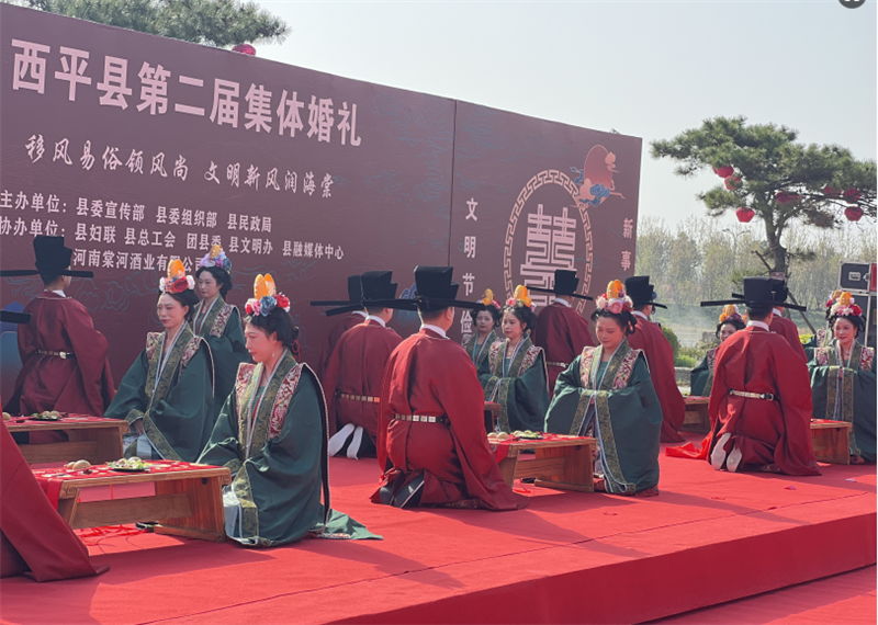 将传统礼仪与时代新风相融合,西平县已举办两届中式集体婚礼;县委书记担任婚礼证婚人,为36对新人送去祝福。