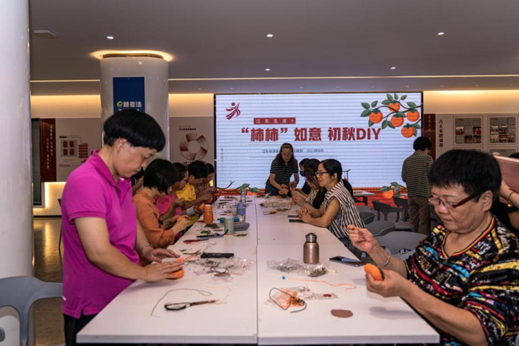 9月1日,浙江省金华义乌市江东街道新时代文明实践所举办“柿柿”如意初秋DIY活动,社区居民在老师的指导下制作柿子香囊。新华网 钟奕摄