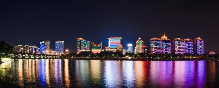 9月1日,浙江省金华市黄宾虹公园拍摄的金华江夜景(5张照片拼接)。新华网 钟奕摄