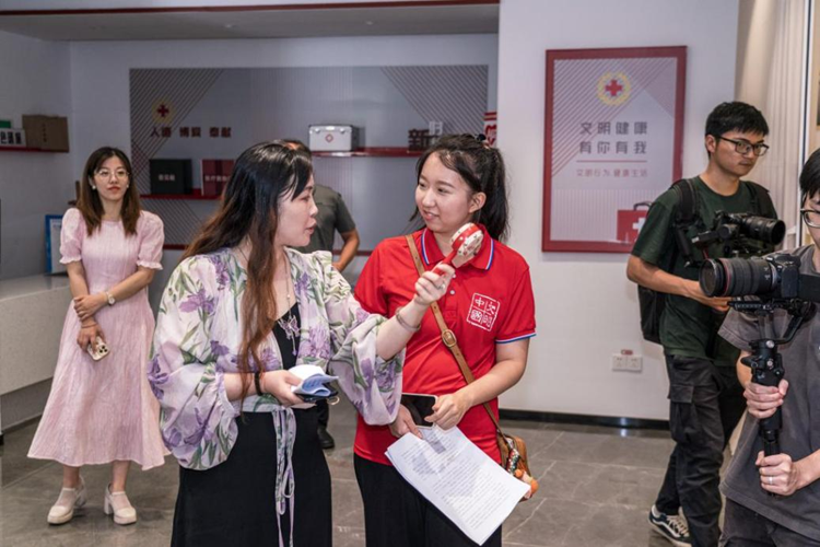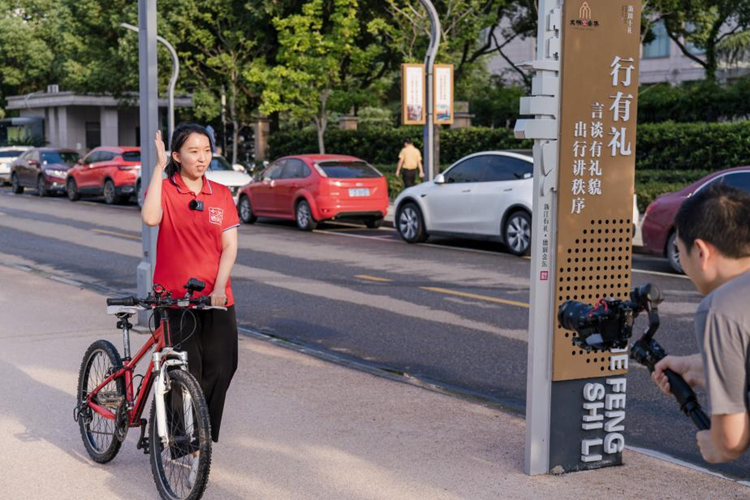 9月1日,“文明中国”主题采访报道组首次开展骑行采访活动,在浙江省金华市金东区实地感受“浙风十礼”示范带。在骑行中实地感受文明有礼示范圈(带)设计理念与推进成效。图为视频录制现场。新华网 钟奕 摄