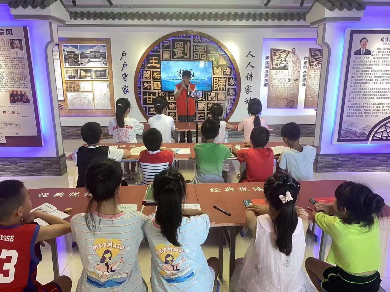 小朋友们在家风长廊聆听志愿者讲家规家训。竹溪县文明办供图