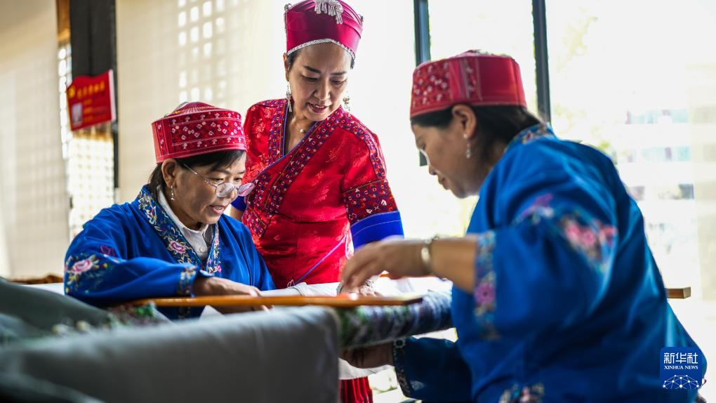 10月10日,苗族绣娘龙禄颖在位于贵州省施秉县的非遗工坊指导绣娘进行刺绣创作。新华社记者 陶亮 摄