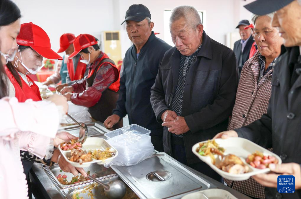 10月26日,江苏省兴化市临城街道赵何村老人在村老年助餐服务点领取午餐。新华社发(史道智 摄)