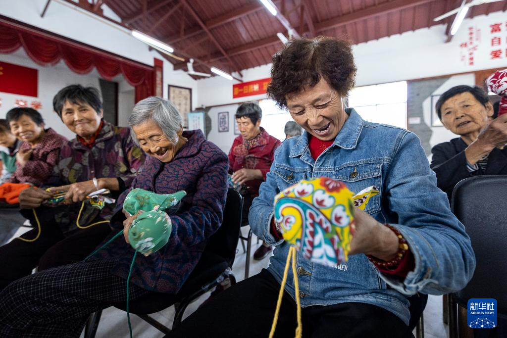10月27日,浙江省湖州市吴兴区道场乡菰城村,老人在迎重阳活动上做艾锤。新华社发(伊凡 摄)