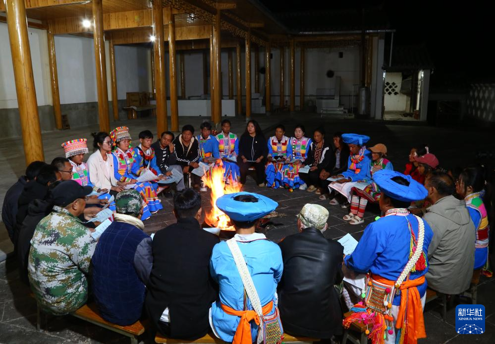 10月27日晚,云南省腾冲市中和镇傈安新村利用火塘会开展“党的创新理论进万家”的理论政策宣传。新华社发(赵辉 摄)