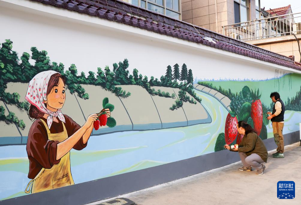 10月27日,江苏省兴化市垛田街道垛田农民画创作者在创作垛田农民画墙绘。新华社发(史道智 摄)