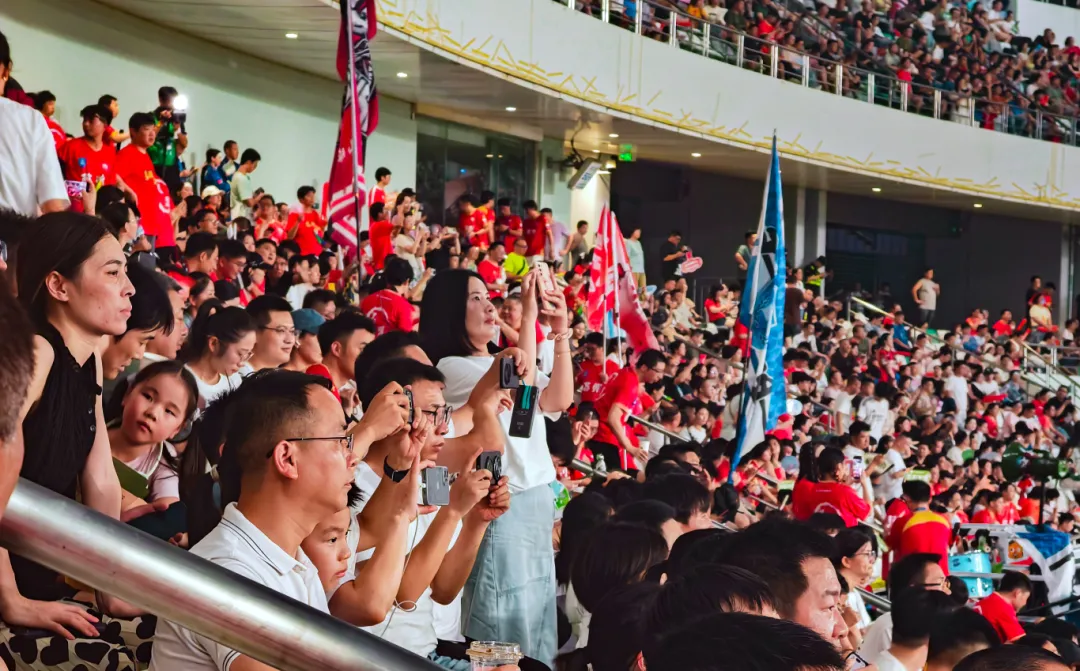 尤其到了比赛最后十分钟,苏州队虽一球落后,却展现出令人热血沸腾的不服输精神。球员们全力拼抢、每球必争,一次次冲击对方禁区,看台上的呐喊声浪一浪高过一浪。父亲抱着孩子、情侣紧握双手、老人们也站起来了——所有人目光灼灼,齐声高呼“苏州加油”!这不仅是体育的拼搏,更是一座城市精神的生动写照:永不言弃、敢拼敢赢。