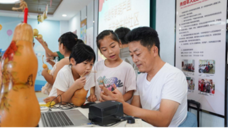 乡村非遗在城市社区焕发新生。安东卫街道贾家湖村的“石绘”文化小院通过文化书院搭建的桥梁,走进安东卫街道万和社区文化书院,30余组亲子家庭围坐创作,双面石头画上的草莓与笑脸承载着乡土技艺的温度。非遗传承人感慨:“看着大人小孩好奇地学,这种文化分享的感觉特别好,要让乡愁在城乡间流淌”。无独有偶,碑廓镇碑廓三村“福祥”文化小院的非遗传承人王鹏,带着葫芦烙画技艺走进金牛岭社区文化书院,为暑假托管班的孩子开启非遗之旅,让“福禄”寓意的传统手艺浸润童心。