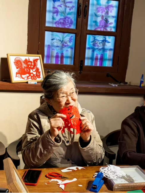 家住所城里社区的春雨奶奶当天和几位朋友如约来小院学习剪纸,屋外熙熙攘攘,屋内的几把红色小剪刀始终没停下,“我从小就喜欢剪纸,愿意做这个手艺,拿起剪刀就想起小时候。”春雨奶奶边剪边说。