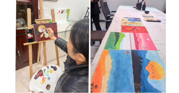 日照市东港区居民张相红,从今年4月份起,每周都到银海社区文化书院“隽飞工作室”练习油画,“每周三下午隽飞老师会来授课,平常这个画室每天都会开放,我有时间就来画两笔,现在已经画了5、6幅了”,张相红边说边展示自己以往的作品,从背景简单的风景画到更多细节的实物写生,半年的练习能看出她的用心和进步,“以前就是喜欢,但从没觉得自己能学会,当时看到我们社区的群里发布了课程信息,还提供画材,我就想着来试试。”