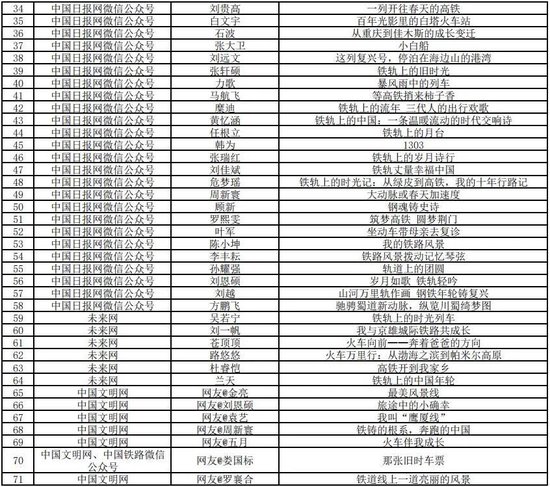 打印:12月30日,由中宣部文明创建局、中央网信办网络传播局、中国作协创联部、中国国家铁路集团有限公司党组宣传部联合举办的“我的铁路风景”故事汇原创美文征集展示活动优秀作品名单公布,共252件。