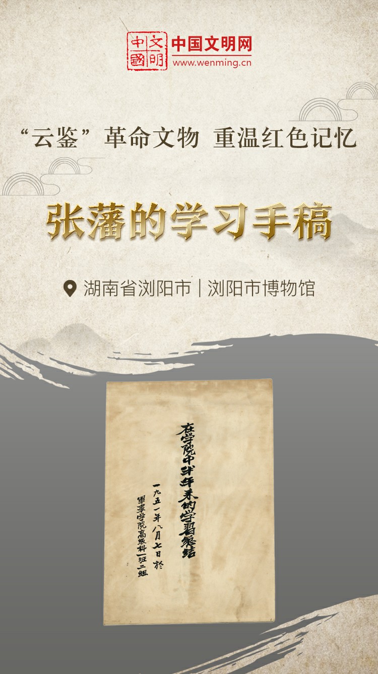 革命文物,承载党和人民英勇奋斗的光荣历史,是弘扬革命传统和革命文化、加强社会主义精神文明建设、激发爱国热情、振奋民族精神的生动教材。中国文明网“文明之声·云鉴馆藏”专栏邀您走进各地革命博物馆、纪念馆、党史馆、展览馆等展馆,一起“云鉴”红色馆藏,汲取奋进力量。今天为您介绍浏阳市博物馆的馆藏文物——张藩的学习手稿。